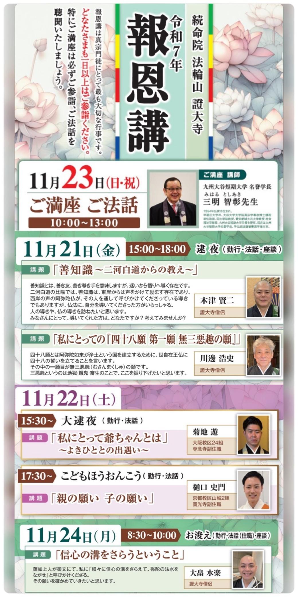11月10日(月) バスツアー 11月11日(火) 10:00-12:00 真宗写経の会 11月12日(水) 11:00-16:00 浄縁の1日 ※11:00-12:00 書道・お経に親しむ 13:00-16:00 浄縁の集い 11月14日(金) 10:00-13:30 介護と認知症の専門家による あんしん講座と相談会 11月14日(金) 11:00-12:00 書道教室 お経に親しむ 13:00-15:30 歎異抄公開講座【歎異抄に学ぶ】―親鸞のことばに聞く― 【江戸川オンライン】 11月15日(土) 15:00-18:00 動物医療グリーフケア安&堵の会 11月18日(火) 10:00-13:30 終活講座 【「これからの私にちょうどいい終活 〜住まいと不動産の安心整理術〜」】 11月19日(水) 10:00‐12:00 『終活とは 基礎講座』 11月20日(木) 10:00-14:00 認知症予防のいきいき講座 11月21日(金) 15:30‐17:30 報恩講/逮夜 11月22日(土) 15:30‐19:30 報恩講/大逮夜・こどもほうおんこう 11月23日(日) 9:45-12:45 報恩講 11月24日(月) 8:30‐10:00 報恩講/お浚え |