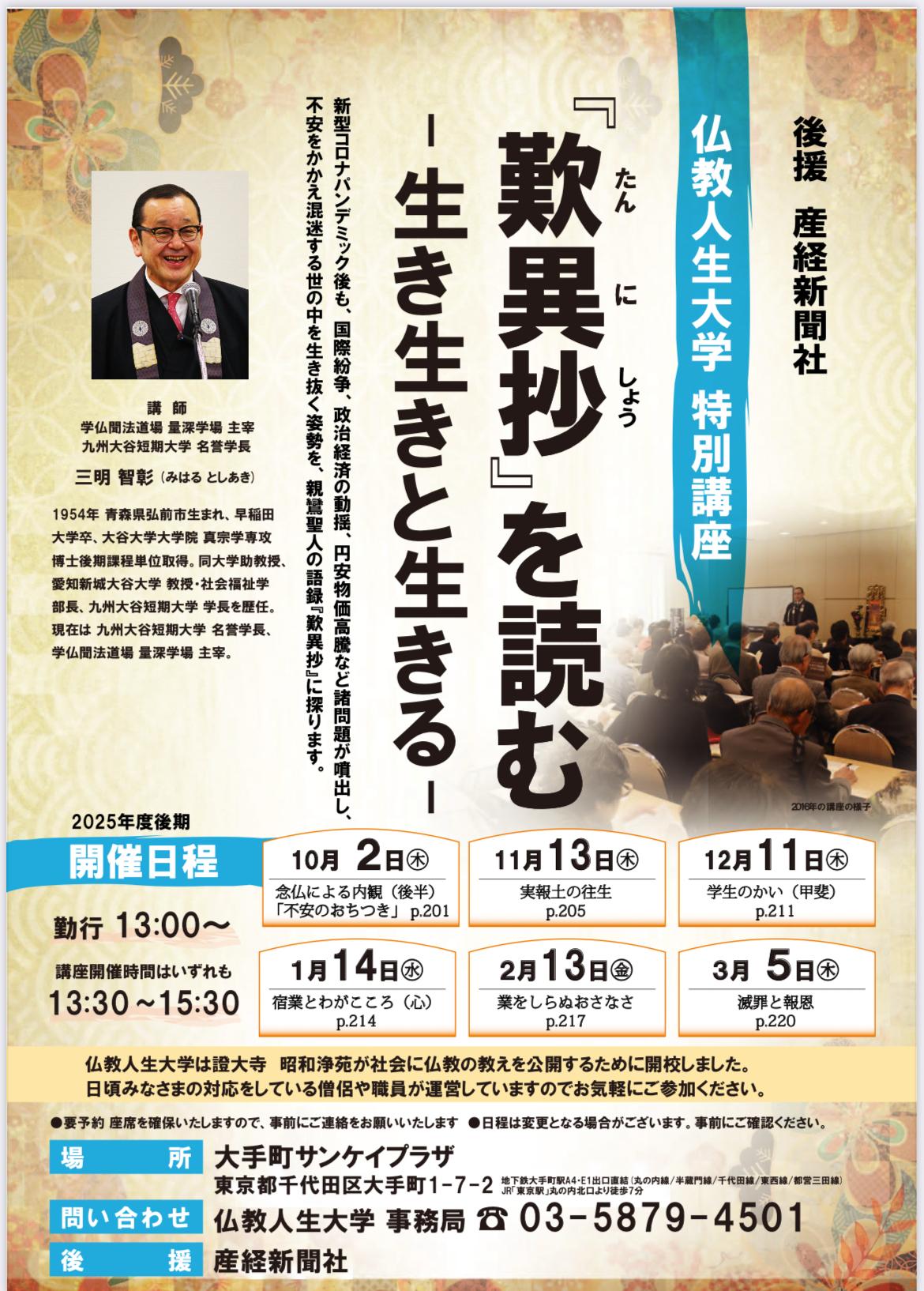仏教人生大学 学生、並びに大手町サンケイプラザでの講座参加者の強い要望を受けて『歎異抄』を始めから学ぶ稀な機会です。皆様お誘い合わせの上、ご参加ください。