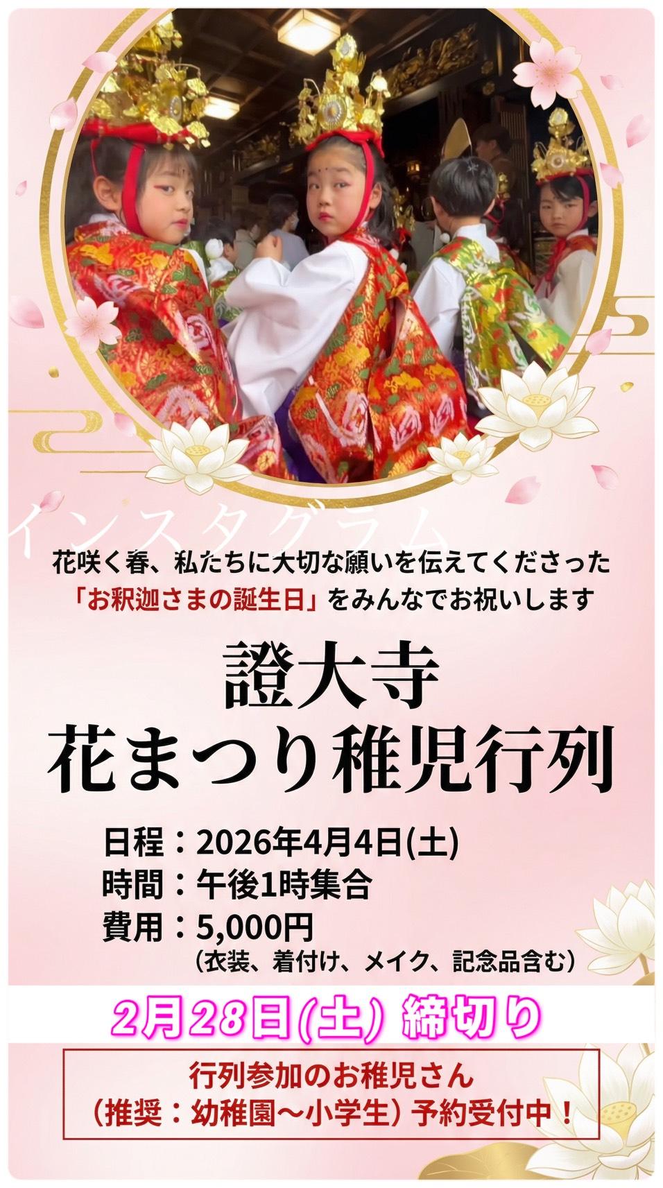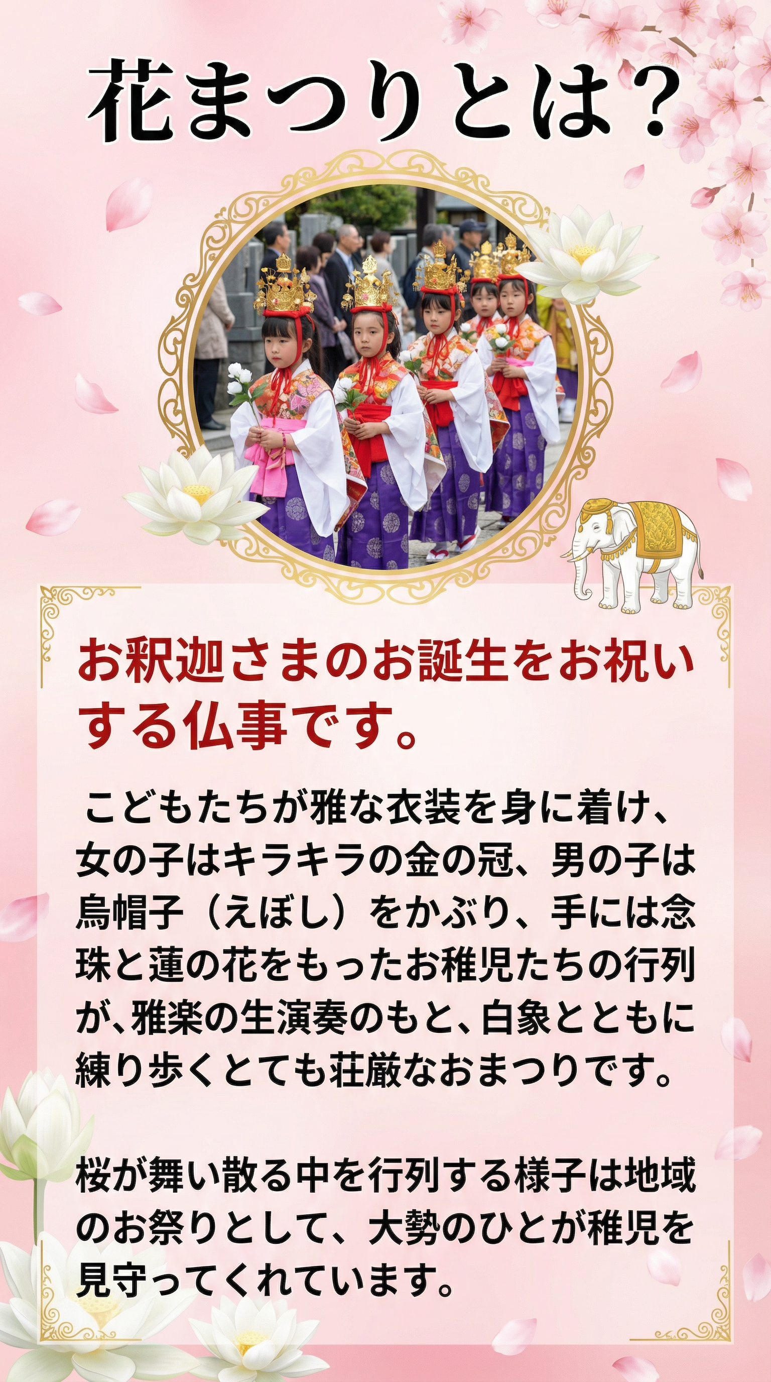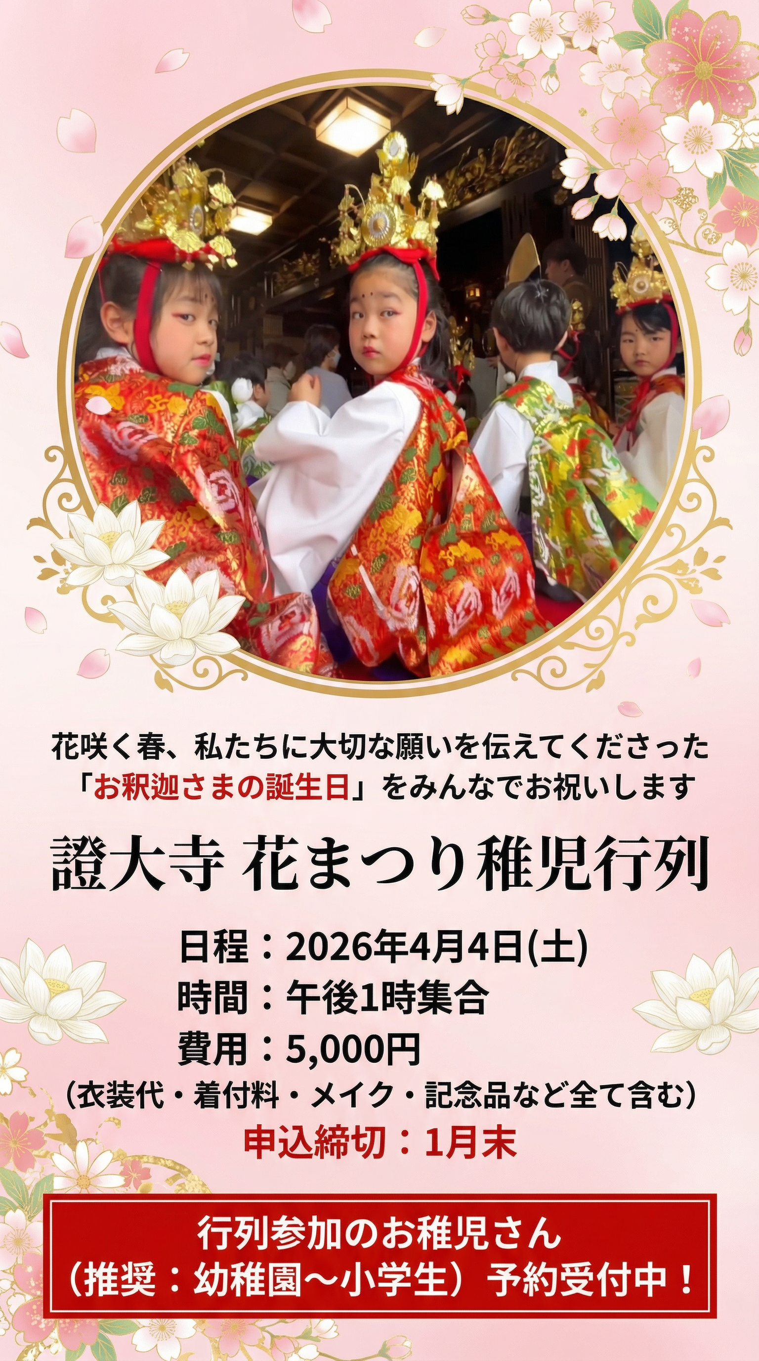 お釈迦さまのお誕生をお祝いする仏事です。 こどもたちが雅な衣装を身に着け、女の子はキラキラの金の冠、男の子は烏帽子(えぼし)をかぶり、手には念珠と運の花をもったお稚児たち の行列が、雅楽の生演奏のもと、白像とともに練り歩くとても荘厳なおまつりです。桜が舞い散る中を行列する様子は地域のお祭りとして、大勢のひとが稚児を見守ってくれています。 稚児行列に参加したこどもたちの父母、祖父母には、20歳なった我が子宛ての手紙「二十歳の君へ」を書いていただきます。この手紙は、 こどもたちが20歳になるまでずっとお寺の仏さまに預かっていただき、こどもたちが成人した花まつりの日にお渡ししています。親や祖父母の願いを時空を超えてお伝えするお手紙です。そこに書かれた言葉は必ず、これからを生きていくこどもたちの大きな生きる力となることでしょう。