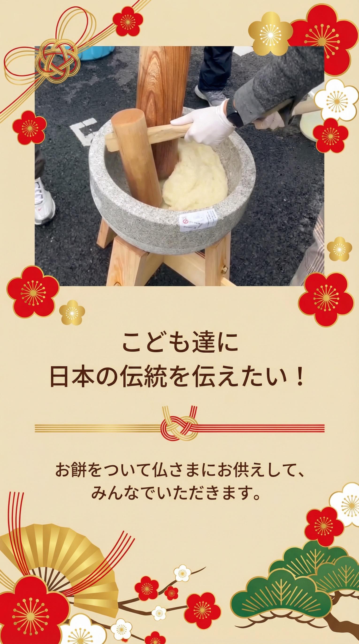 書初め作品は、お寺のギャラリーに展示して参詣者のみなさまに公開します。 「書初め」のあとは、お寺の山門前で餅つき大会です。こどもから大人まで一緒になってお餅をつきます。ついたお餅は、まず先に仏さまの 尊前にお供えします。皆様は月でウサギが餅つきをしている話を聞いたことがありますか。お釈迦様の生まれる前の物語(ジャータカ)に あるストーリーで、お釈迦様が昔ウサキだった頃に、お腹を減らした人を助けたいと願いながらも何もあげらるものがなく、自ら炎の中に飛 び込んで、腹を空かした人に身を捧げたと伝えられています。焼かれた身が煙となって月に届き、餅つきをしてお腹を減った人、寂しい人を励ましているという慈悲の教えなのです。餅つきを通してお釈迦様の慈悲の心や布施の心、感謝の心を養います。